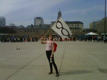 (I just love this picture I snapped of a colleague. She made this flag herself! In case the symbolism is lost on you, we’re both librarians).