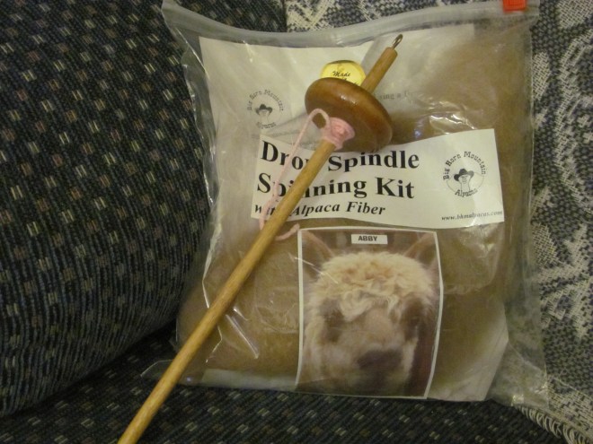 And naturally this meant I needed a spindle. I found a basic high-whorl for a decent price on eBay. I happened to come from a family in Wyoming who raises their own alpacas, hence I ended up with a kit with more oh-so-soft roving.
